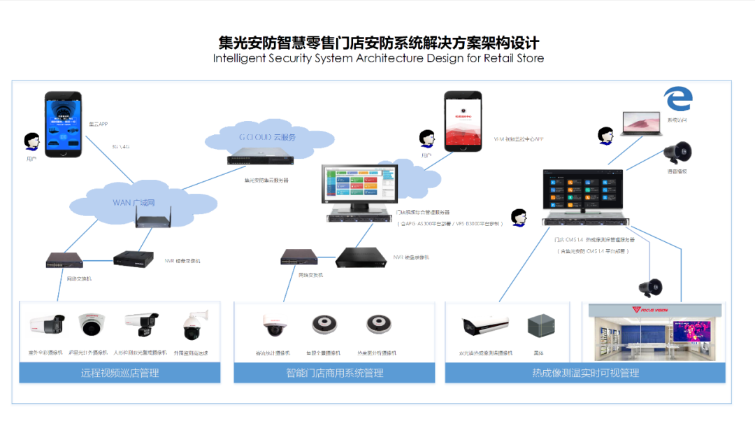 yabo.com鸭脖安防双光智能警戒系统 支持门店部署,摄像机部署于门店出入口, 除可满足门店视频监控功能外,当顾客进店时,该系统可第一时间通过前沿人形检测视频分析技术识别顾客进店状态,按后台预设欢迎语播报欢迎语音进行提醒,便于店员及时提供接待服务,提升门店新老顾客进店的体验及满意度,系统支持yabo.com鸭脖安防G-Cloud集云移动客户端远程视频管理、报警邮件推送。